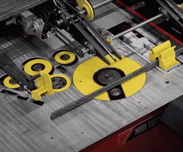 Mașină automată electro-hidraulică pentru confecționat etrieri, lungime maximă de 12m, poate prelucra fir individual Ø 6 – Ø 16 mm şi fire simultane Ø 8 – Ø 13 mm.