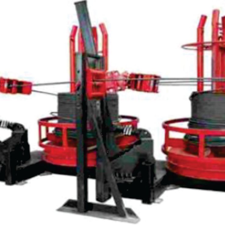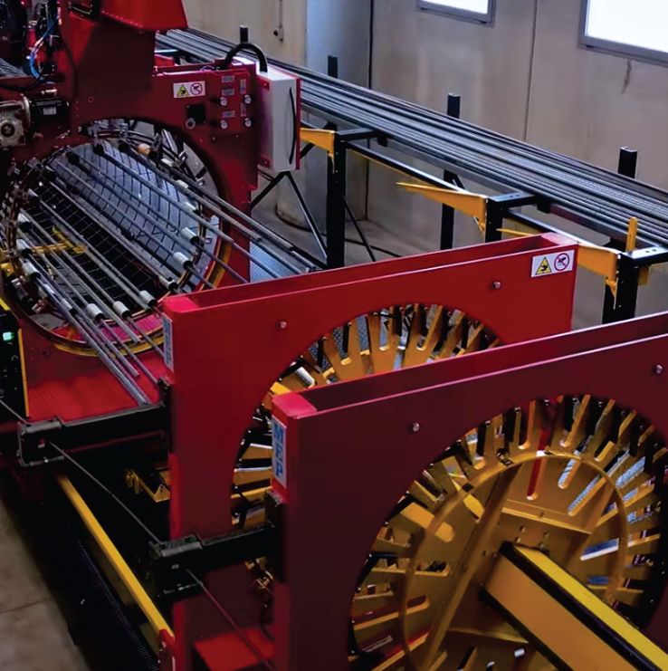 Mașină automată electro-hidraulică pentru confecționat etrieri, lungime maximă de 12m, poate prelucra fir individual Ø 6 – Ø 16 mm şi fire simultane Ø 8 – Ø 13 mm.