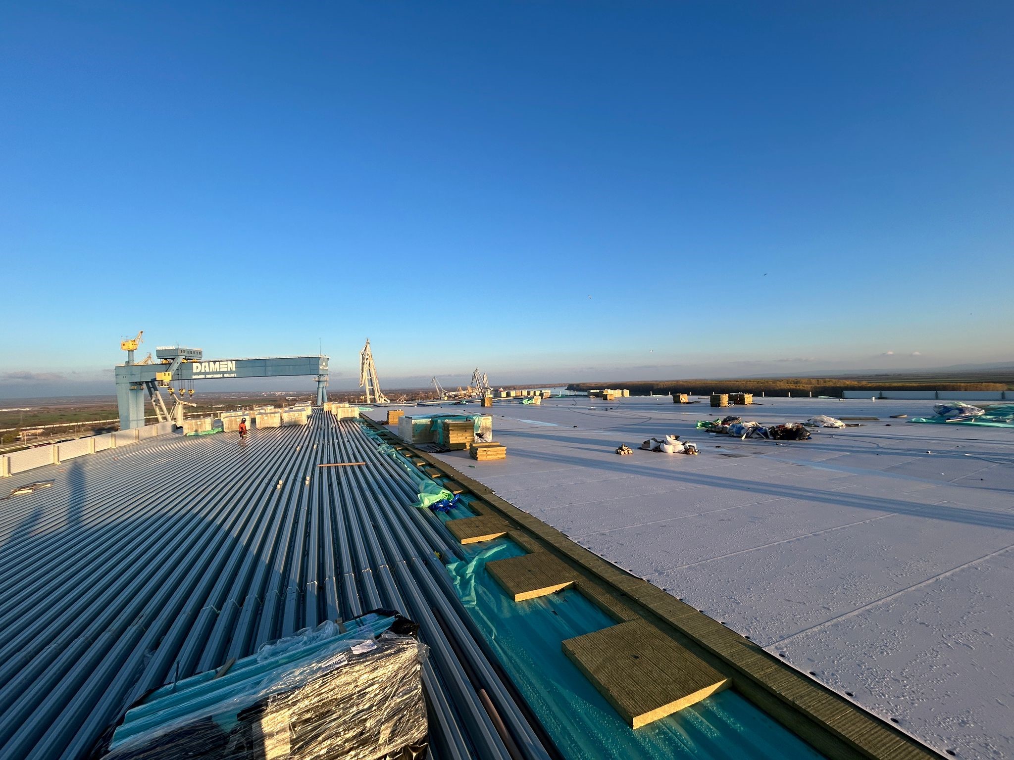 Închiderile au constat din panouri sandwich la pereți și sistem de învelitoare tablă cutată trapeziodală – vată bazaltică – membrană termosudabilă PVC.